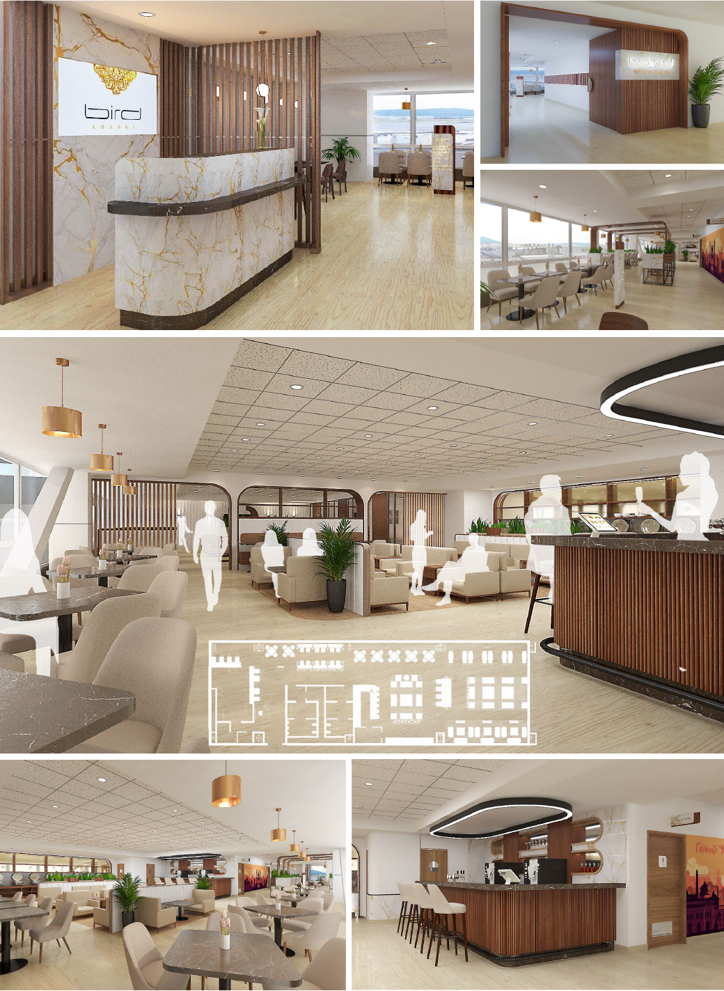 Starting with the front desk, seating area and bar, the space uses wood, copper metallics, and marble to create a clean modern look for their frequent flyers.